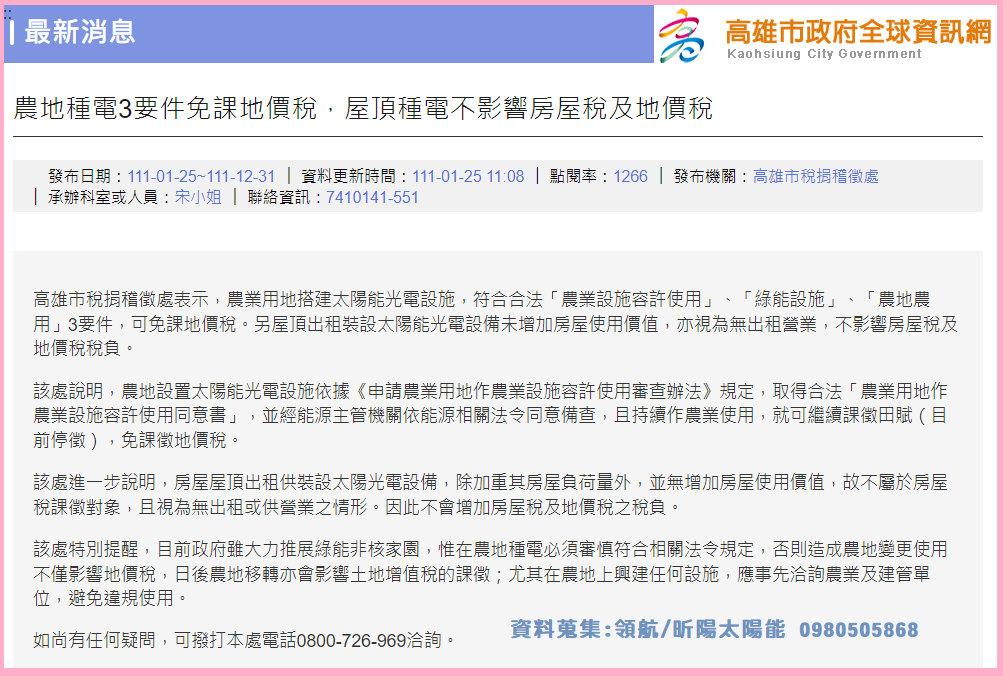 高雄市稅捐稽徵處表示,農業用地搭建太陽能光電設施,符合合法「農業設施容許使用」、「綠能設施」、「農地農用」3要件,可免課地價稅。另屋頂出租裝設太陽能光電設備未增加房屋使用價值,亦視為無出租營業,不影響房屋稅及地價稅稅負。